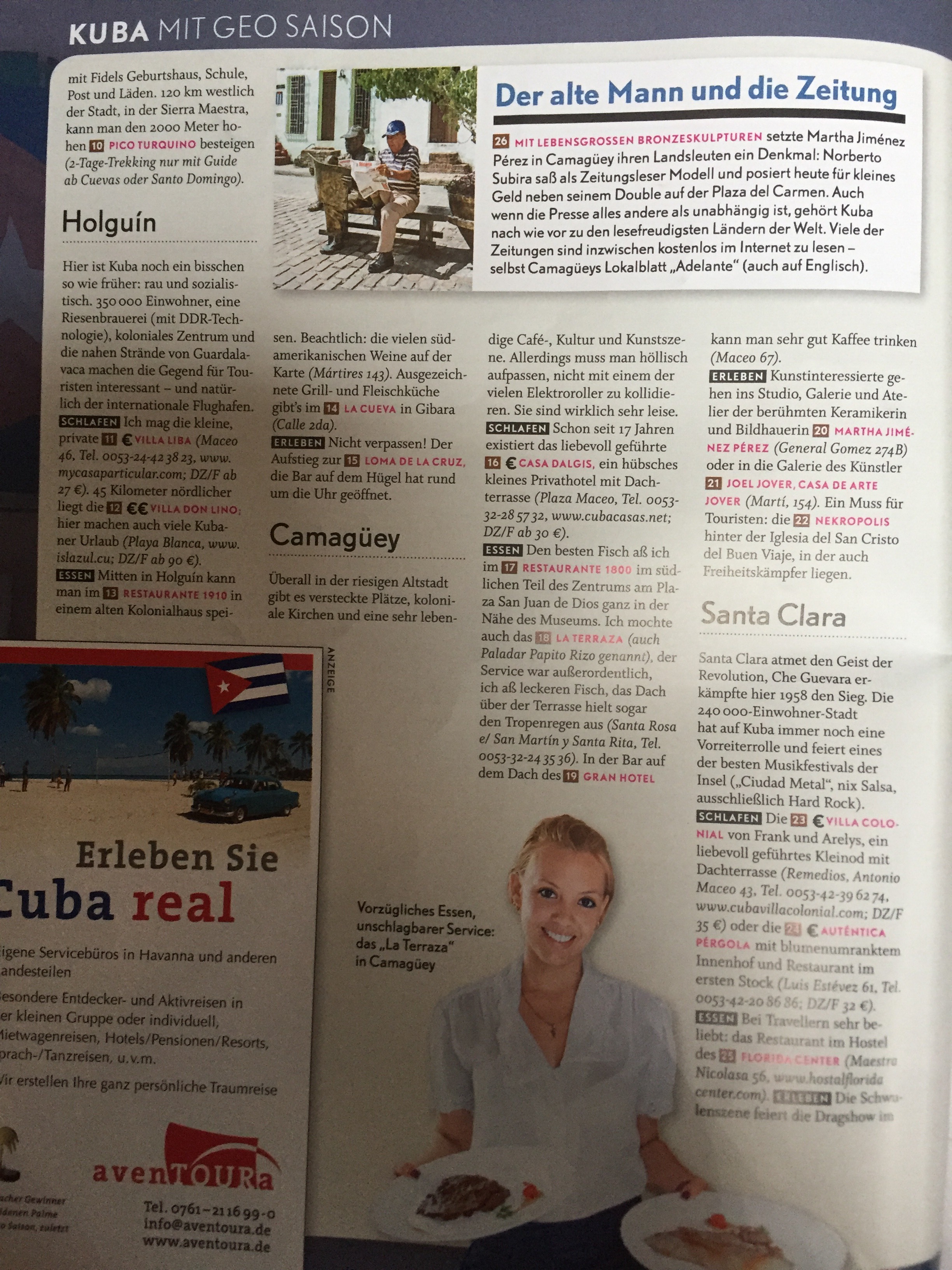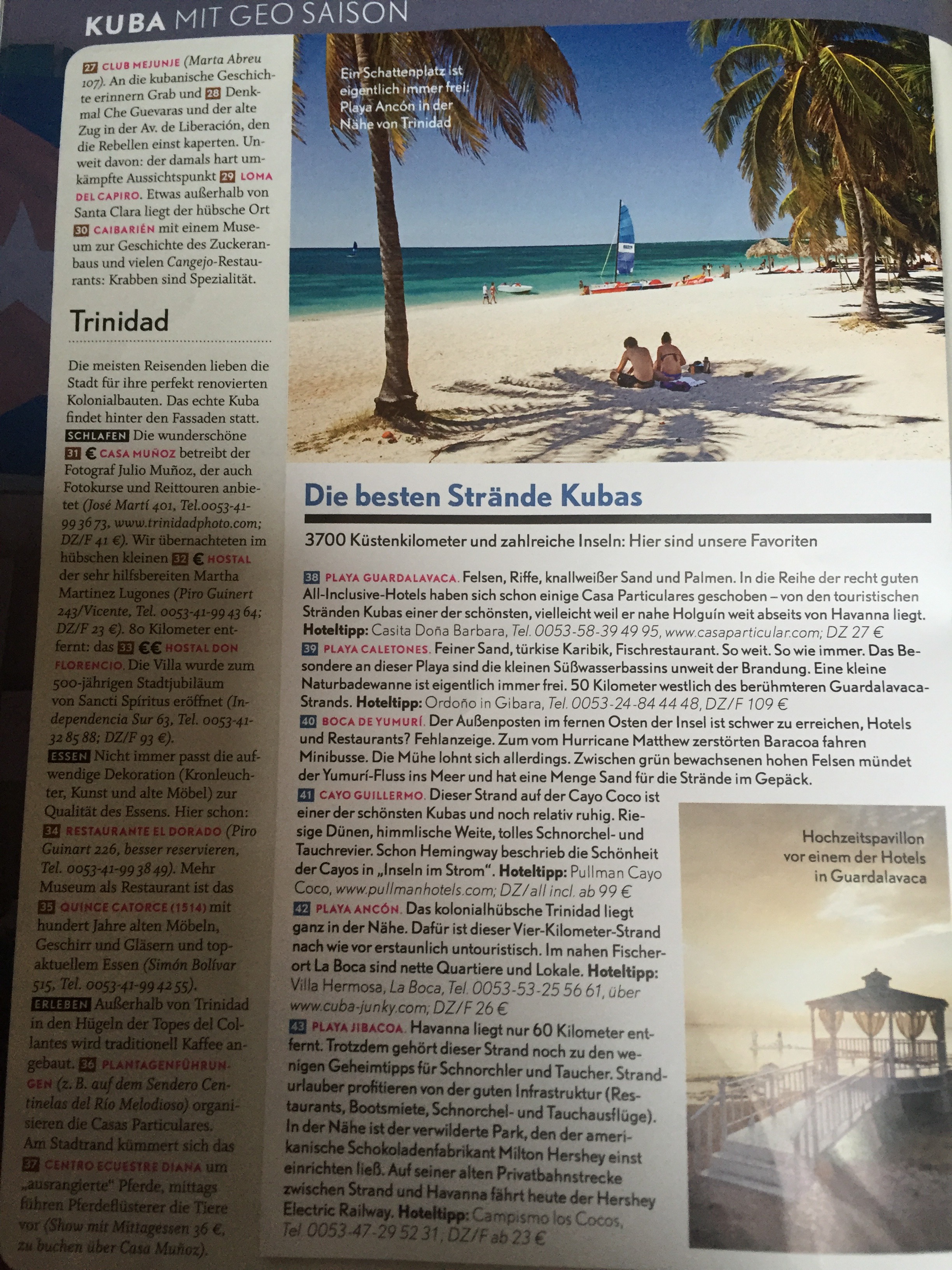 GeoSaison, Germany’s leading quality travel magazine, featured Cuba as their January 2017 cover story. For those of you lucky enough to speak German, please take a read of this fascinating feature, co-written by me, which takes you far, far beyond the cliches for an in-depth look at this ever-changing Caribbean nation. It includes a detailed look at the best off-piste beaches and the most interesting stop-offs in each of the main regions of the country. You can read the full feature through purchasing the January edition of the magazine.