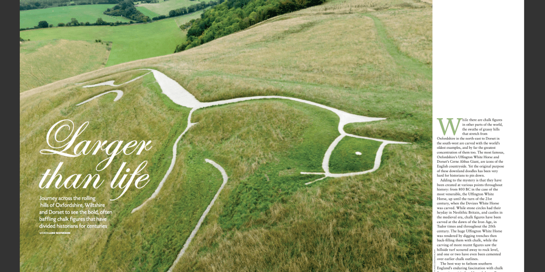 It is a landscape bypassed by many, as they motor between London and the Southwest of England: often experienced as a fleeting glance across at Stonehenge’s imposing circle of menhirs, sarsens and trilithons. But the chalky hills of Oxfordshire, Wiltshire and Dorset – the Wessex Downs – are one of the UK’s most important ancient regions, and not just for stone circles. Once upon a time in this landscape various cultures began to carve giant hill figures, the chalky likenesses of which stood out, awed and, subsequently, perplexed thousands of people. What did these gigantic doodles represent? Who did them, and why? From the Uffington White Horse, one of the world’s oldest and largest chalk hill figures, to those that came after it in later centuries, my latest feature for Britain Magazine looks at and explores one of the most singular ancient historical phenomena in Great Britain.